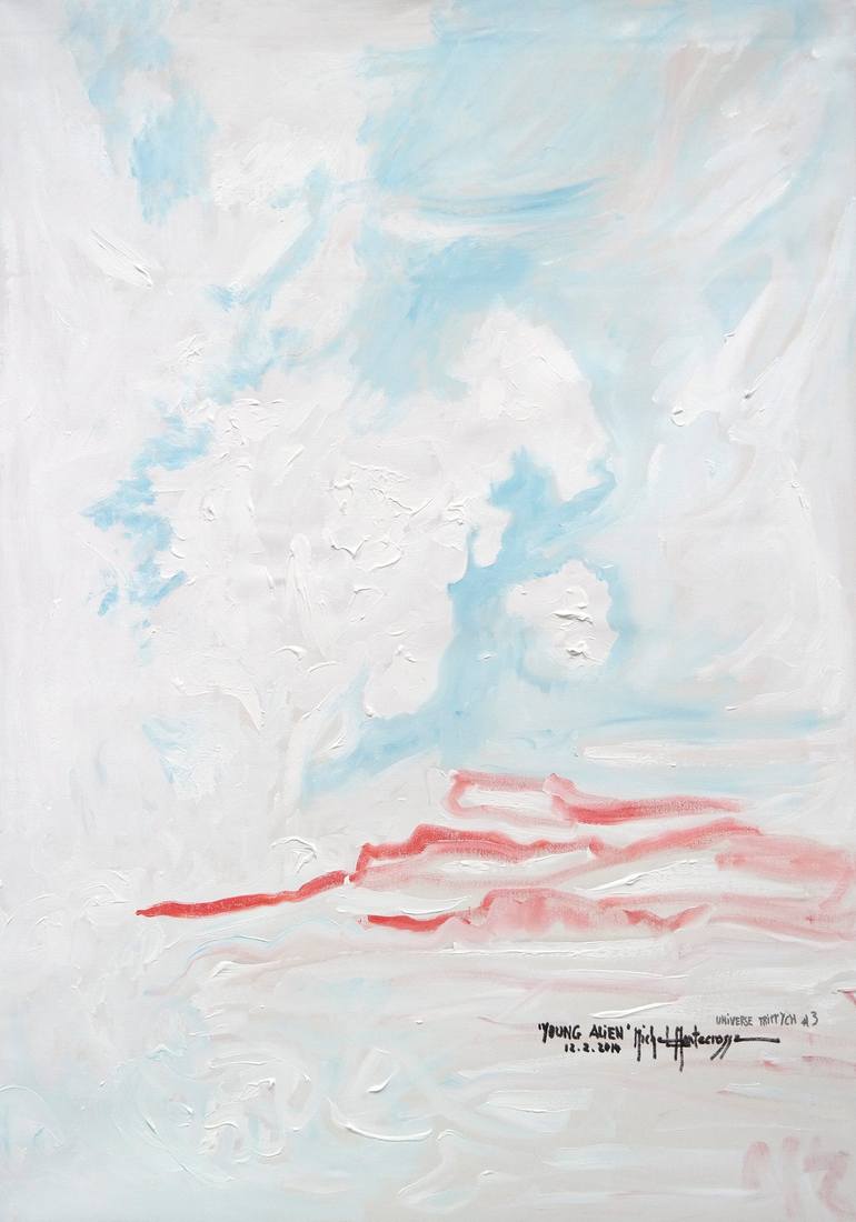 ’Young Alien’ is the right side painting of the Triptych, titled ‘Universe’. Delicately painted a young alien moves in the bright air of a distant planet. The light in light atmosphere of white and blueish white is rooted in a determined, empathic roseate ground structure leading into an intensely w...