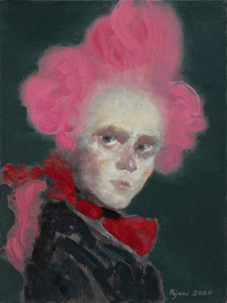 Young man in a pink wig. 2020. Oil on canvas, 16 x 12 x 1.3 in, (40.6 x 30.4 x 3.4 cm)