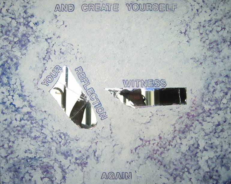 I painted this piece based upon the words "witness your reflection" that had popped into my head. For me, the power of sentient consciousness is not just to recognize "I am", but also to ask "what am I?" The image on this painting expresses the contradictory nature of being vs. asking what being is....