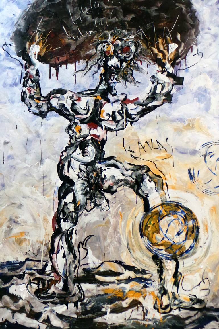 En su madurez artística Nievas retoma la pincelada de los años 80, incorporando estos trabajos a la serie de "personajes en transito", bien surgiendo la memoria de la forma a través de improntas sobre textil y plásticos. En ésta obra retoma los grandes gestos de brocha y espátula. Los negros estalla...
