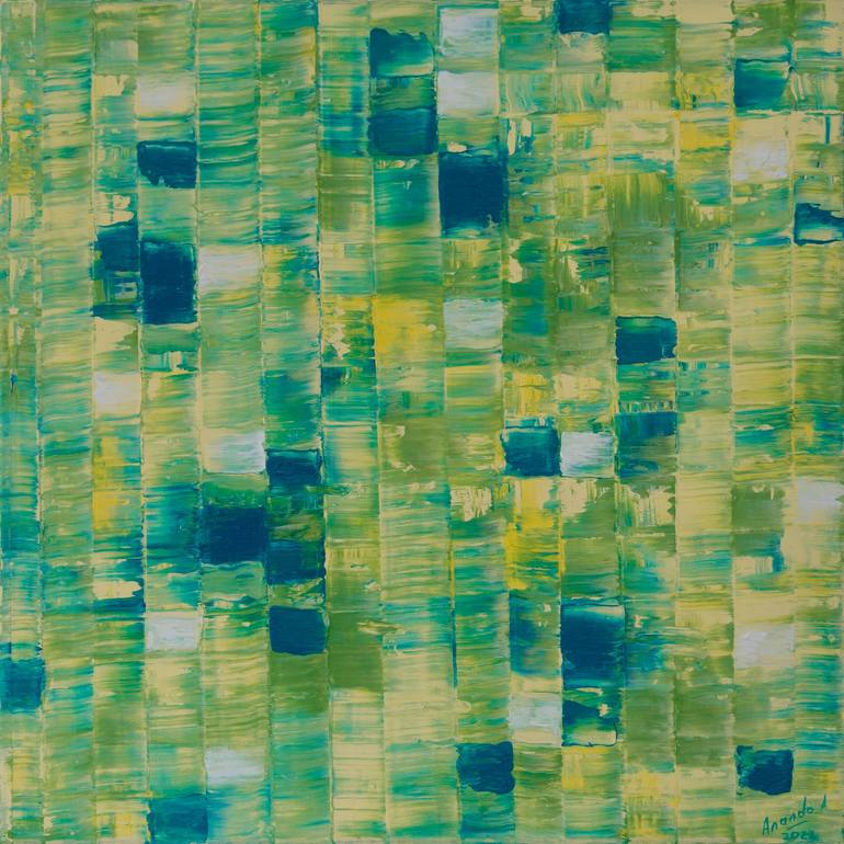 An abstract original oil painting by the painter Anando Arnold. Light green, ocher, accents of warm golden yellow, dark blue and white are the defining colors of this abstract painting. Can you feel the soothing warmth of summer, the light breeze, the refreshing coolness of the forest, a small lake ...