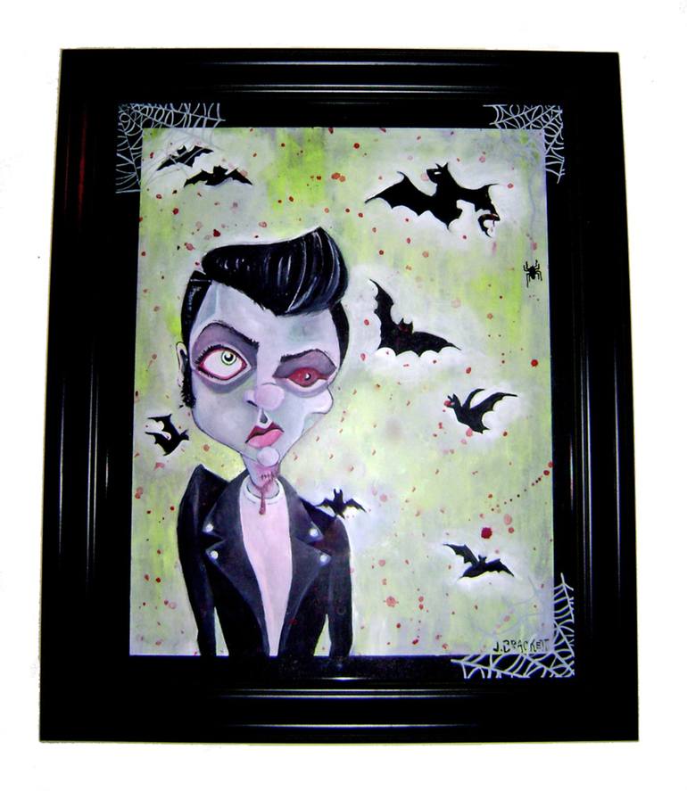 Jennifer is a formally trained artist that is constantly pushing the boundaries of her training and talent. She graduated from the prestigious School of the Art Institute of Chicago and had a residency at The Slade in London, and since then she has exhibited and sold her art at several shows. She is well versed in many mediums and particularly utilizes pens, gouache, oils, printmaking, and spray paint to express her artistic visions. Spray paint has been the medium of choice lately, and her large scale work on concrete and wood canvases has been attracting a lot of attention. What her main focus is the human face, producing zombie-like creatures that express a multitude of emotions, from dead pompadoured greasers brandishing punk rock sneers on giant spray painted boards, to hot rockabilly girls expressing despair and longing. What comes across in her art are original interpretations of her many eclectic influences, giving a new visual representation to such things as rockabilly and gory horror movies. She is fortunate to have the freedom to create whatever her inspiration dictates, but she has also had successful collaborations with clients who have requested specific works from her, and she is always interested in new challenges and demanding projects where her talents can shine.