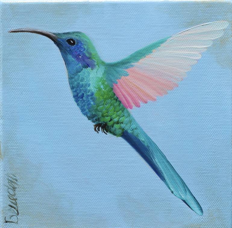 High Quality Oil on Canvas 6 in. x 6 in. 15 cm. x 15 cm. Ships in a box Free shipping included One of a Kind Piece This small and very colorful painting is part of the collection COLORS OF THE GARDEN. It has a light blue with gold. The hummingbird is a symbol of God's grace, power and speed. It a...