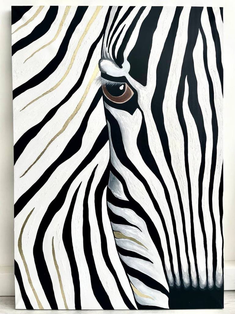 Zebra is a symbol of life in safari. Life is a complicated thing. There are black and white stripes, but there are more white stripes! In the picture, in addition to black and white stripes, there are also gold ones. Gold as a symbol of wealth and luxury. The painting is made on canvas, canvas on ...