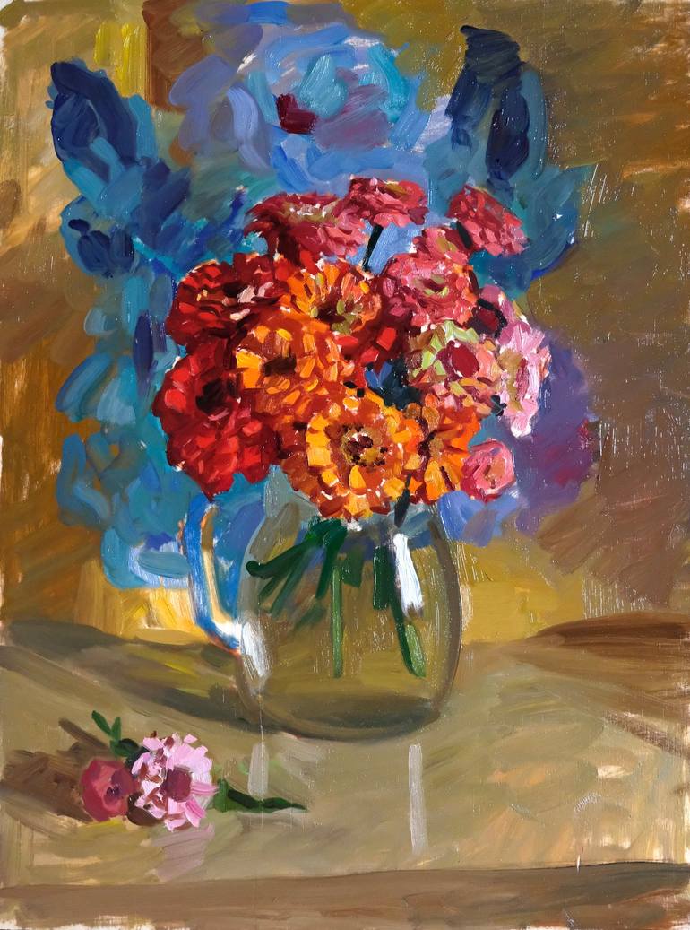Zinnias, painted from life on wooden panel in Florence, Italy.