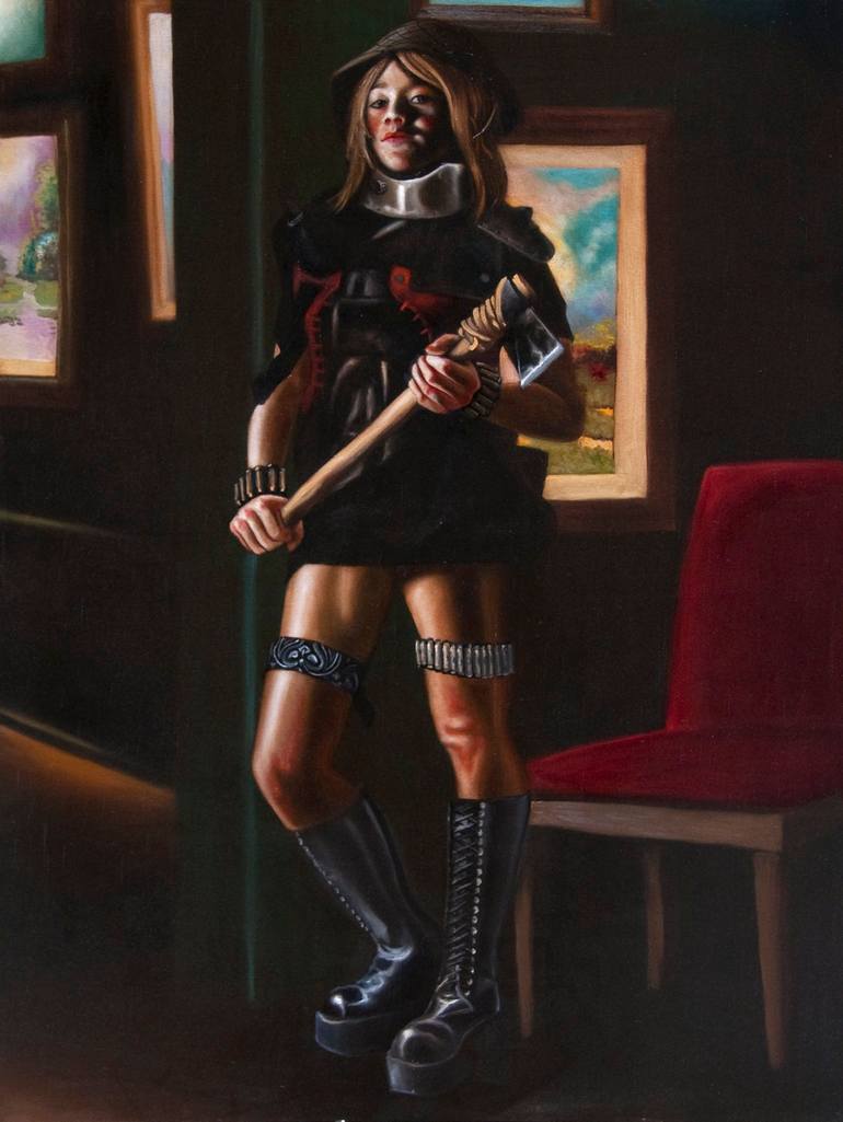 My most recent work has explored themes of juvenilia: images of power and sexuality, glorified violence and objectified women, neither ironic nor naieve, but mindfully gratuitous. Past themes have included self-portraiture and retellings of biblical narratives to account for the presence of dinosaurs.