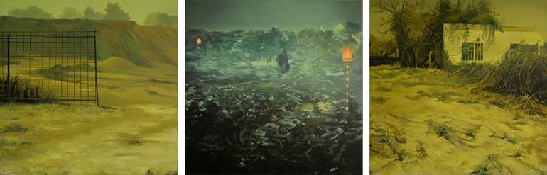 The triptych consists of three paintings, each 35.4" high and 35.4" long. The first and the last painting of this triptych depict parts of decrepit landscape with abandoned and ruined construction sites and living areas from various locations in the city of Zagreb, while every central painting of e...