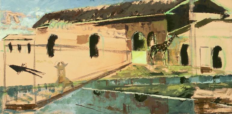 Purchased by Nippon Steel for their corporate collection. Exploring the human need to collect, this work depicts animals and religious objects from Africa in both a zoo and a museum. The multiple layering of planes and the colors are reminiscent of the African landscape evoking varying times, pla...