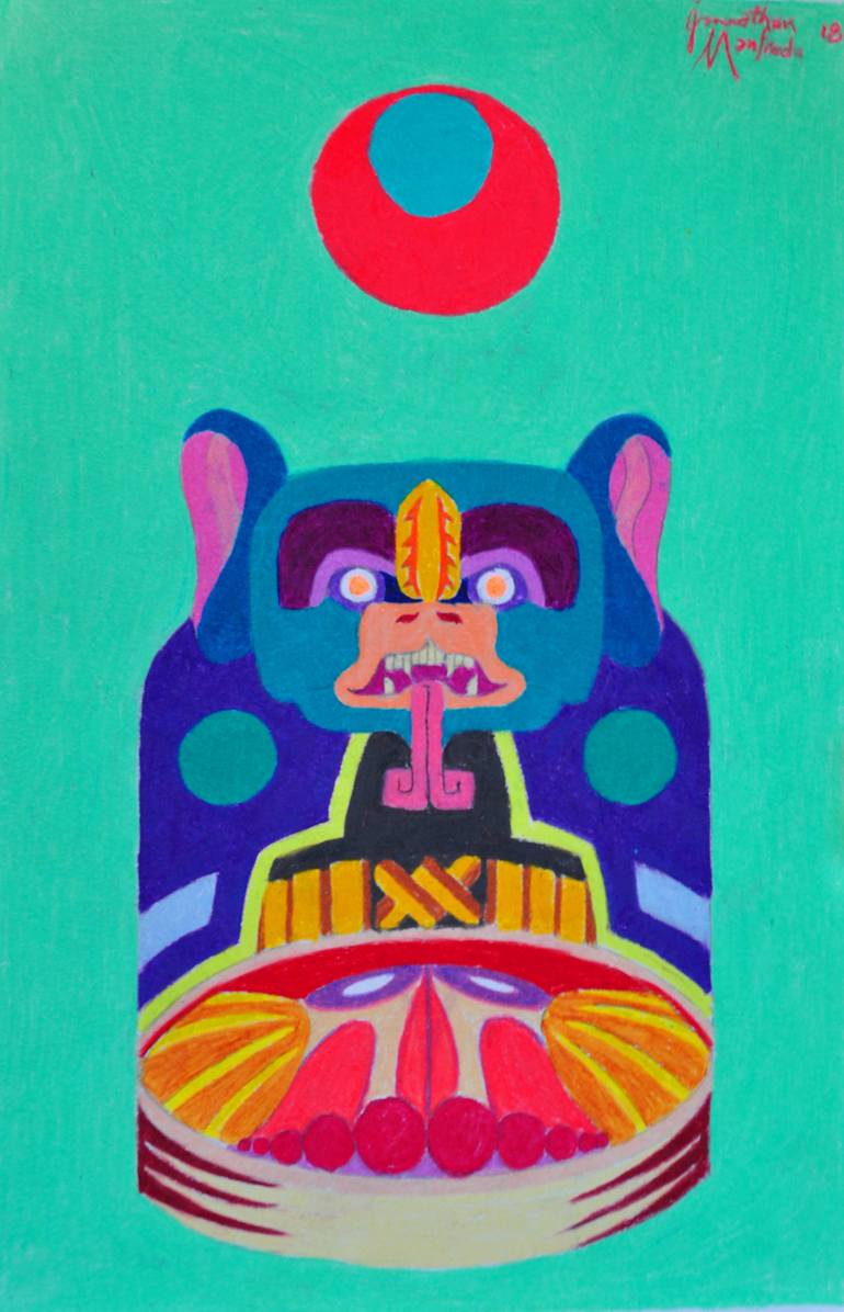 Zotz, the bat! Lord of the darkness, his symbol is the eclipsed circles. Servant of the Gods to complete cycles. Zots bit the Vulva of Xochiquetzal condemning women to menstrual period and at the same time starting the cycle of life. Zotz closes the cycle when he becomes the executioner, decapitati...