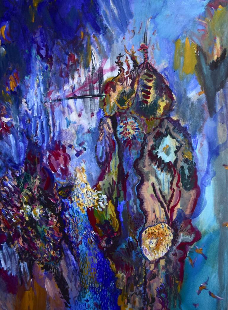 A watery, dreamy, abstract narrative, the painting features an insect-like creature contemplating a bursting floral character. Thickly textured and extremely vibrant, the piece is also inspired by the colour palette of sea creatures and the mysterious quality of jellyfish. Painted with archival qual...