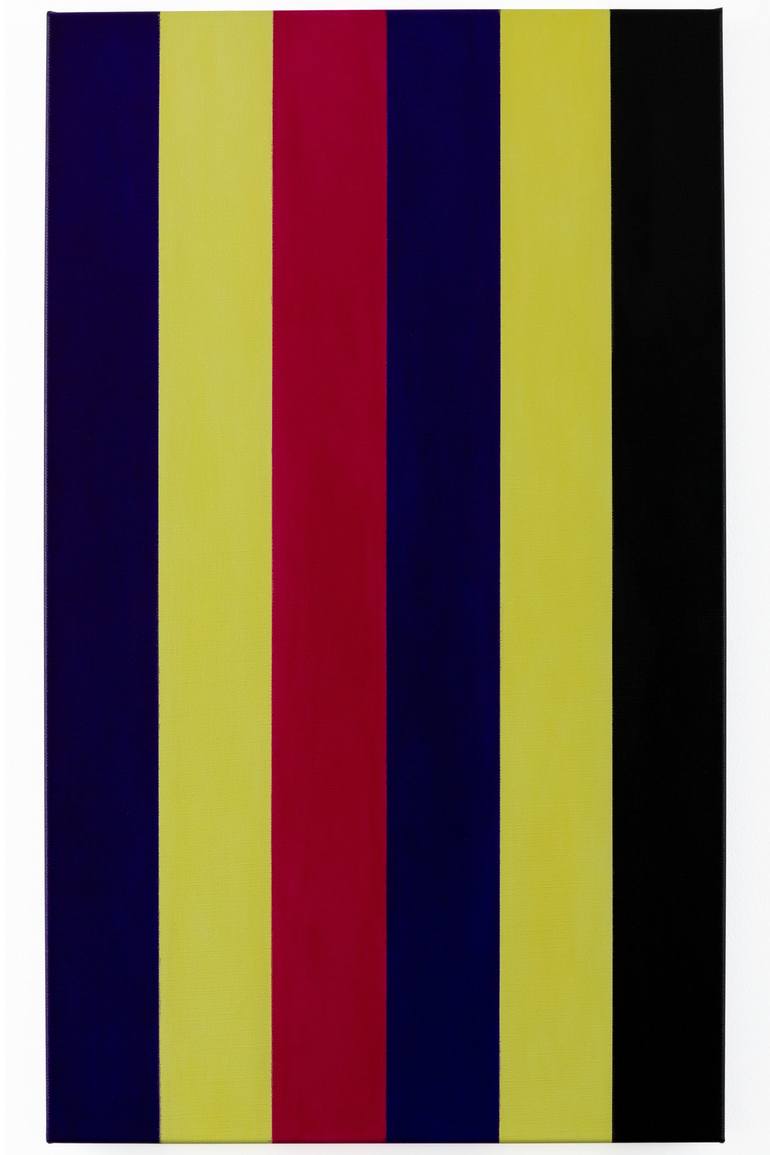 Geometric striped colorfield painting. Painted with violet red, violet blue, bright nickel yellow and blackhighest quality pigments in a special acrylic dispersion. The reduced geometric minimalistc composition favors the perception of the colors. Although the painting has multiple thin layers, the...
