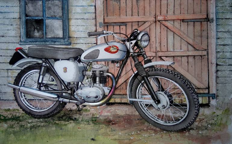 A watercolour painting of a popular BSA c15 motorcycle with a few non standard modifications, this successful four stroke single produced throughout the early sixtieswas subsequently eclipsed by the rise of Japanese motorcycles to Europe and USA