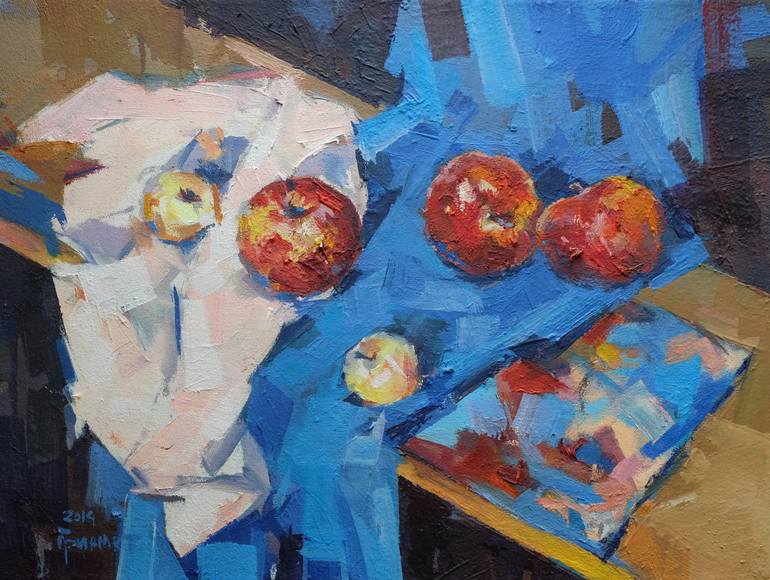 oil painting on canvas(on wooden underframe). By this link https://youtu.be/Lq9On75j8Cg you can watch a short video, which I've made in order to let you see this artwork in live. p.s. the artwork colored with dark blue color by perimeter (the sides of the underframe)