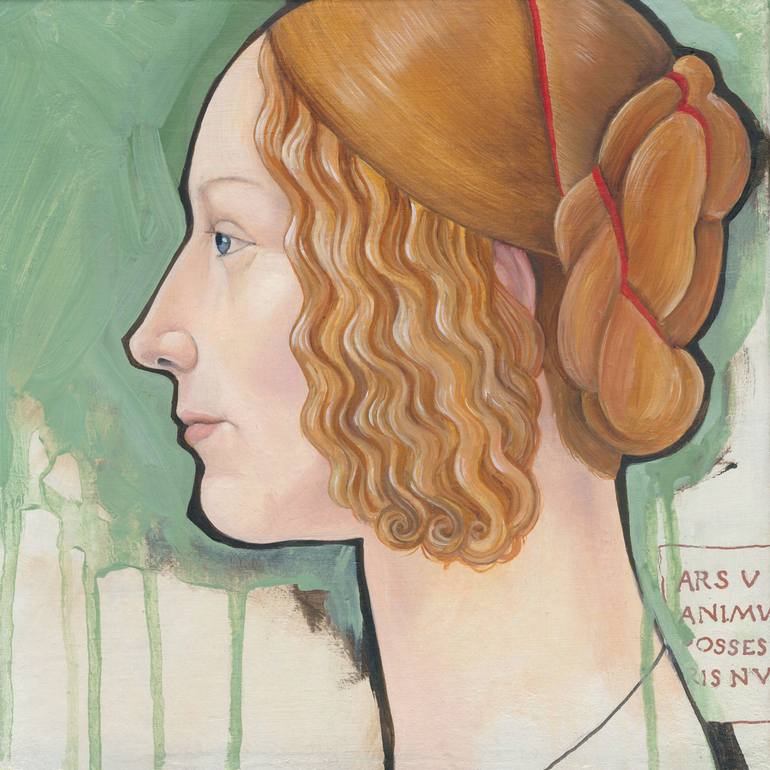 A reworking of an old master painting. The title comes from a description from the artist included in the painting. Unframed, sides are painted white. Painting is wired and ready to hang. Signed, titled and dated on back.