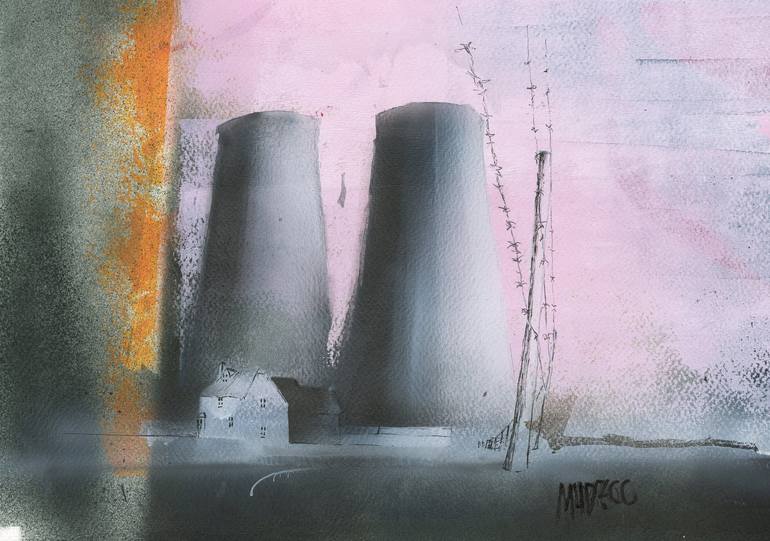 perimeter fence with farmhouse, and cooling towers. Acrylic and ink on 300gsm watercolour paper. Existential contemplation of now. What once was the future is now obsolete.