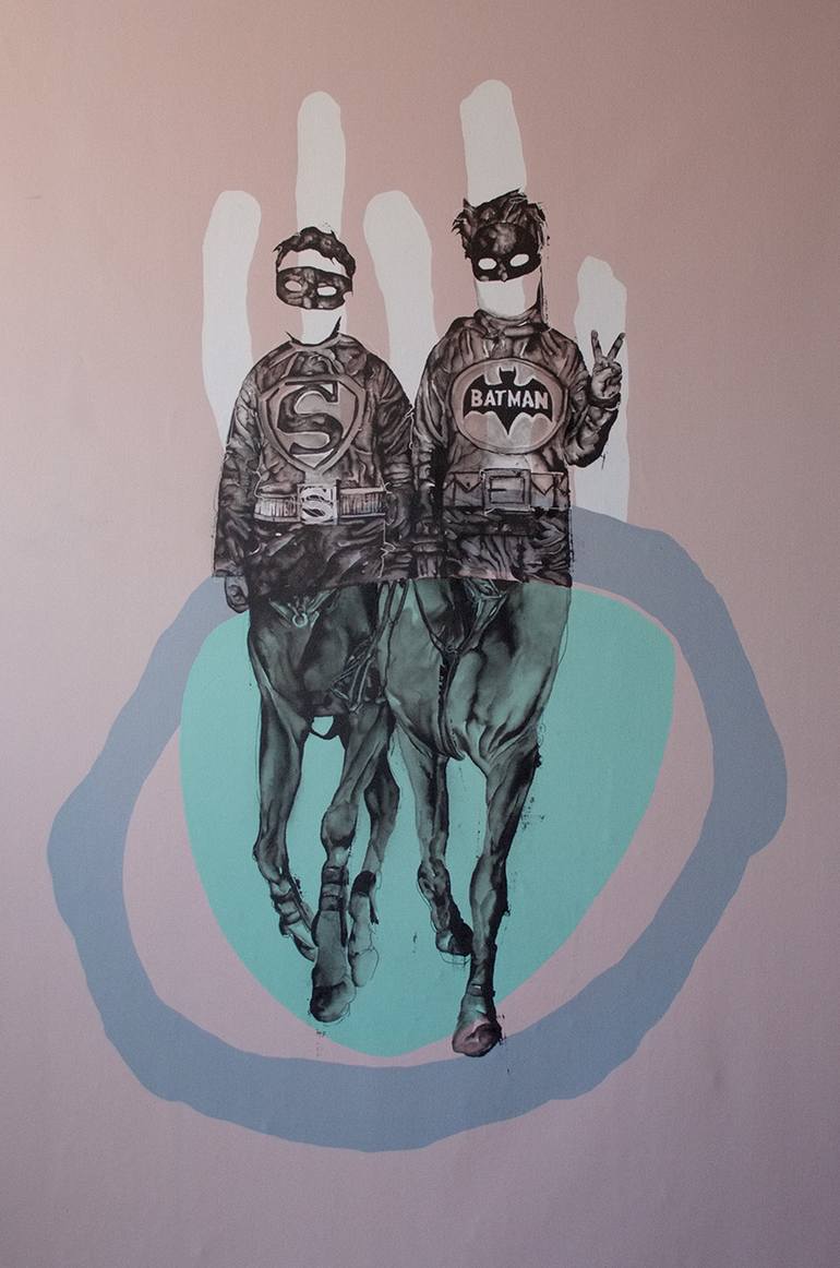 Dan Monteavaro dba MONCHO 1929 (Puerto Rico, b. 1975) Originally from South Bronx, Dan Monteavaro’s artwork can be found in the multiple private, city, and corporate collections; from Google, Inc. to the French Consulate of the US, and from The City of New York, Paramount, the NBA, MLS and Universal Pictures, to the Public Art collections of cities like Glendale, Los Angeles, and West Hollywood. Most recently, Dan Monteavaro’s work was acquired for the permanent collection of Iowa Museum of Modern Art (The Figge), exhibited at The Tokyo Metropolitan Museum of Art and he was included in the juried BP Portrait Awards for The National Portrait Gallery in the United Kingdom. Dan currently lives and works out of Los Angeles, CA Moncho1929, (Dan Monteavaro), creates captivating works of art the challenge his audiences to reconcile with the dualities of contemporary life. With exhibitions around the world and even a recent invitation to the prestigious Venice Biennale, Moncho1929 has been producing work under the radar from the prying and commodifying eyes of the arts industry, yet stunning his growing audiences internationally. As the pandemic forced the world indoors, Moncho 1929 used this time to explore, contemplate, and find new depths in his growing Chimera series. His intricate and awe-inspiring works abstract reality, forcing his viewers to question the ways we perceive the world around us. The term chimera conjures images of mythological hybrid beings or scientific species where two opposing biologies exist in a singular being. Moncho 1929 toys with those conceptions to produce his peculiar combinations. What strikes the viewer first is the familiarity; they recognize a human figure, a horse body, the barrel of a gun. Then, confusion. Lost in a temporal entanglement, the wild west meets the industrial age with accompaniments by elements of modern life, the viewer witnesses one object seamlessly transition into another. At first, the work may solicit a giggle, as they examine the fusion of a bicycle wheel conjoined to the body of a horse, but as they continue to examine, the humor imbued in the work gives way to recognition of the absurdity. As these creatures emerge from the canvas, Moncho 1929 manages to maintain a balance. The surreal nature of his chimeras is elegantly complemented by the delicacy of line and color.