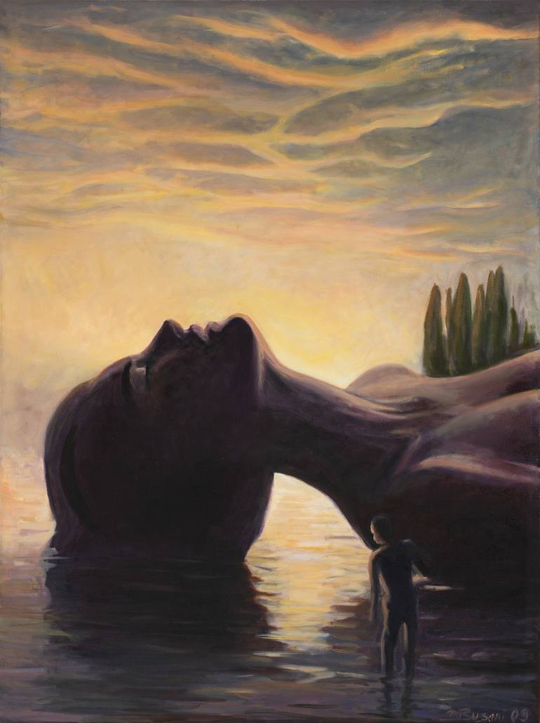 A small human figure leans forward to try to see what is beyond a strange promontory that has the shape of a charming female face, the sunset in the sky and the cypresses on the horizon give the scene a somewhat gloomy atmosphere. A metaphorical image, what does it suggest to you ? The artist has pa...