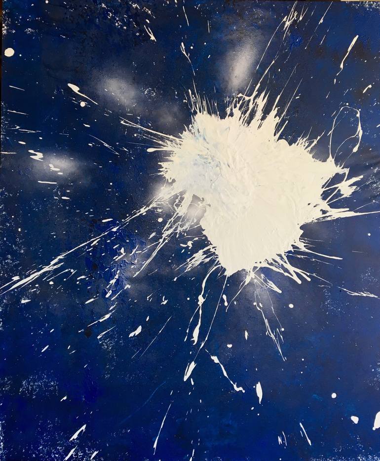 Coming from the traditional east-asian calligraphy i developed my own technique from there. Set on a blue background this brushstroke in white represents this one moment of absolute concentration and focus. Displayed at the other art fair chicago 2018.