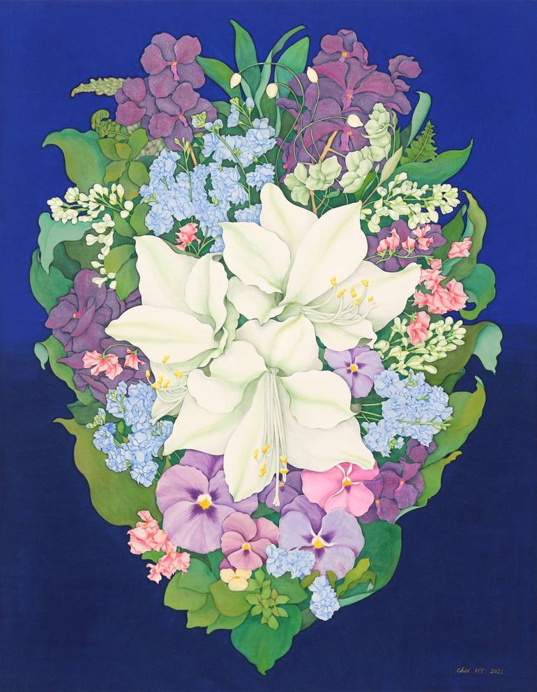 This work belongs to my Hwahap Series, created by building multiple layers of mineral pigments on silk. The bouquet is composed with a restrained palette—violet tones, lapis blue, soft whites, and subtle pink highlights. At the center sits an amaryllis, surrounded by calm floral hues that harmonize ...