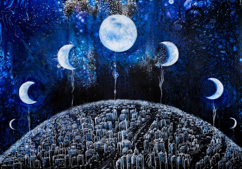 Bring a touch of the mystical and symbolic into your home with this original, hand-painted acrylic artwork. Surrealism meets astronomy in this abstract urban landscape, creating a captivating visual experience. This medium, vertical painting features a deep blue night sky, complete with glowing moo...