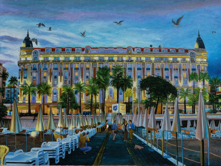 This is an evocation of Cannes movie festival, painted in pointillism, except characters end some details in flat.