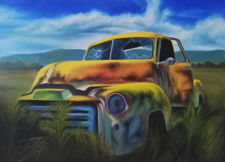 It is a work created as an oil painting on canvas in a realistic way with vivid colors. It is an issue treated as abandoned car. the edges of the canvas are painted.