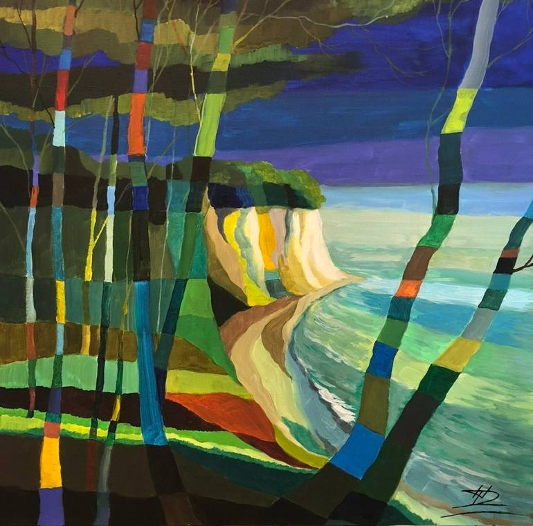 The painting titled "Chalk Cliffs on Rügen" depicts a vibrant and colorful natural scene on the island of Rügen. The focal point of the artwork is the iconic white chalk cliffs, set against a stunning turquoise sea, creating an impressive and captivating view. Surrounding the cliffs are tall trees, ...