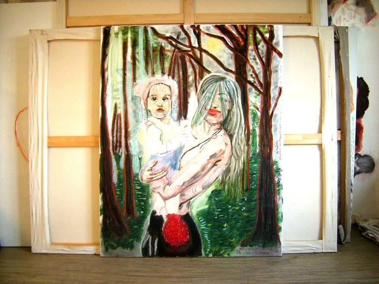 investigation of soul some private voodoo theoretical speech as is often used to explain artwork, is not my medium. i use a lot of bad language in my daily life, that's how i can express myself with words. when i paint, it is very important to me how many unexpected things happen in the painting and while i'm painting. if there's nothing unexpected happening, the painting is bad, i trust my unconcious more then my concious. concious usually bores me. if not, i would be a philosopher. i start depicting a living object in each painting. while the painting evolves it can become totally abstract to the viewer.(not to me) i couldnt' do abstracts, would bore me. there must remain enough realism..... too wundervoll, is bad too. i use a lot of beloved artists' ways to paint and do art and mix several kinds in one painting, and write their names in or besides my paintings. there are karen kilimnik, tracey emin, doig, richter, kahlo, eisenmann, dumas, donachie, clemente,höch, von freitag, krystufek, goya, paula rego, otto dix...many more... i absolutely love art.a lot of art. anselm kiefer writes:............................. i'm interested in reconstructing symbols. it's about connecting with an older knowledge and trying to discover continuities in why we search for heaven........................................ me, myself, i'm looking for the older knowledge in my unconcious, probably finding, as jung would say, archetypes, symbols, which are maybe the same for all peoples in the world, maybe finding kind of an universal language.....