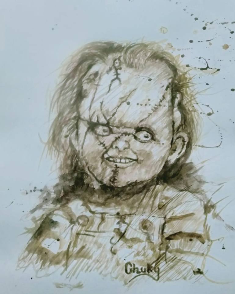 I drew a chuky doll in coffee on paper. Using coffee as a medium, it will give the impression of a natural and antique color and it will give the impression of an antique and unique doll. And it will give a distinct impression to the audience of my work.