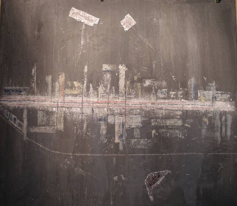 Mixed media on board. Imaginary vision of a city that grows along the axis of a road. Streets hanging or raised. Neighborhood flying moored along a path. Stations wings its ups along via. Urbanism improvised or advantage.