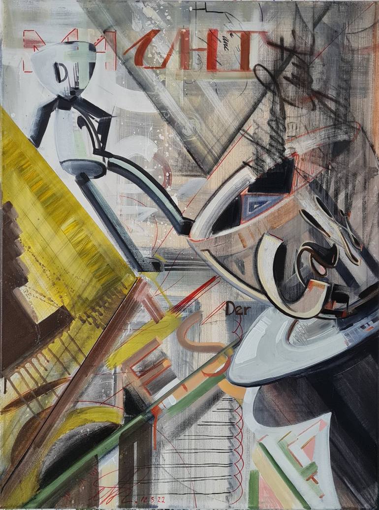 Eric Hubbes was born in London and spent his youth in Francfort and then in Cologne. After one year in Scotland at Glenalmond College, where he focused on fine arts, he knew that art was his passion. After graduating from high school, he studied geosciences with 3 successful semesters and mathematics before returning to art. he then develops design and watercolor in Cologne and acrylic painting in Bonn, from the Alanus Academy of Arts. He then decided to study Fine Ars at the University "HKU" in Utrecht. After 3 successful semesters he came back to Cologne to go his own way, the university was too restrictive for his creativity. Since then, he has been living and working in Cologne Over time, Eric Hubbes developed his own personal style in which he related abstract and figurative painting. This also creates a play between geometric shapes and writing, which can be found in all his works. You could also think of these as fantastical worlds emerging from his subconscious. This idea arose mainly from the brooding that every person is inclined to. His main concern is to reflect the questions and ambiguity of our time in his pictures.