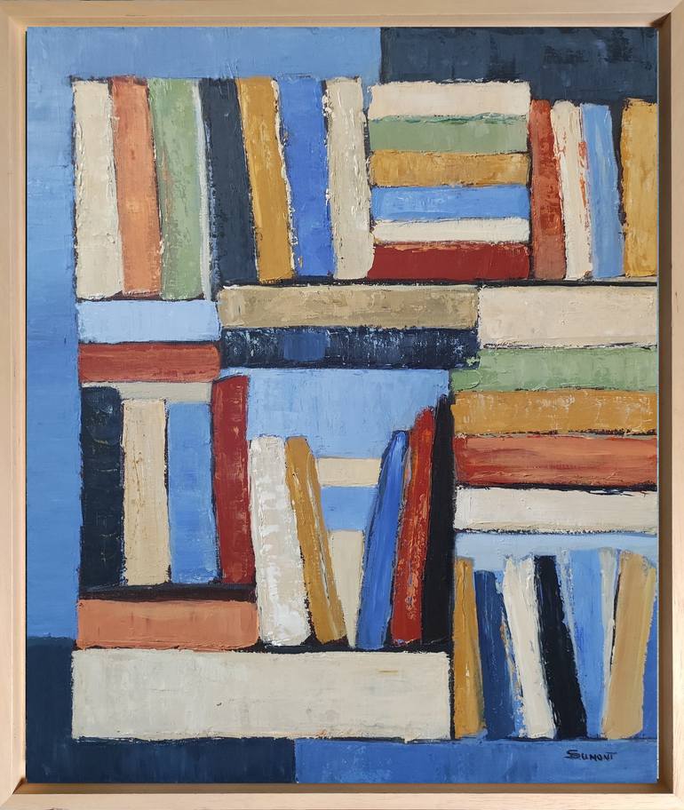 abstract and geometric painting of books in a library. The colors are bright, mixing warm and cold colors. The library is a favorite subject of the artist who began his series in 2016 and is still relevant Oil on canvas worked with a knife with a fairly large impingement brought by the succession of...