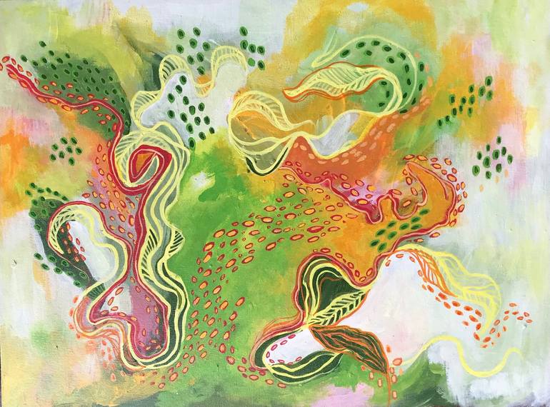 Conversations is abstract inspire from nature the sensitive line work to bold shapes .The stories intertwine in areas and stand separate in others yet there is the overall feel that communication is taking place and one element impacts the other. acrylic on canvas signed back and front with lette...