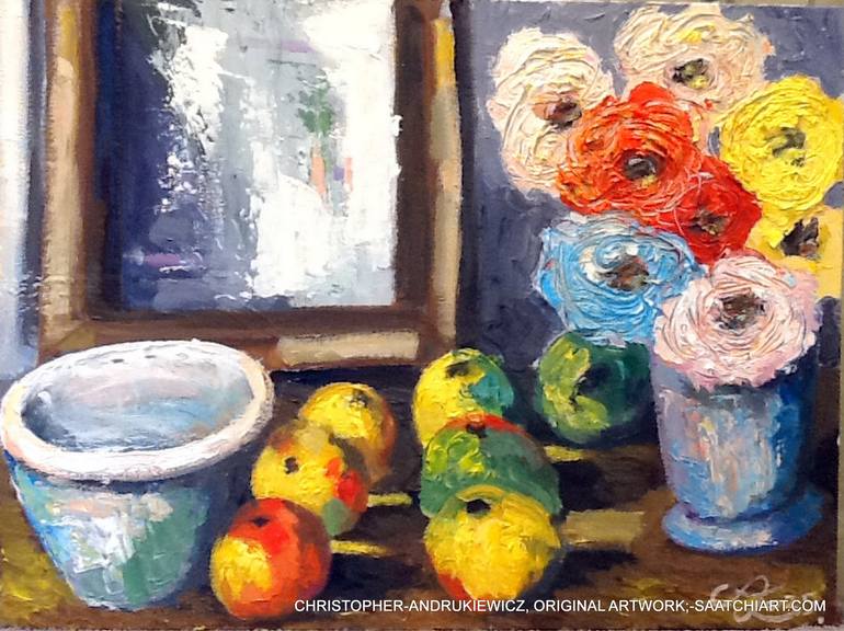 a developed still life, a frame next to vase and apples, with a single apple behind a vase of flowers. a split between the apples and flowers are connected with the individual light traces, between the apples. oil on canvas board. heavy oil paint.