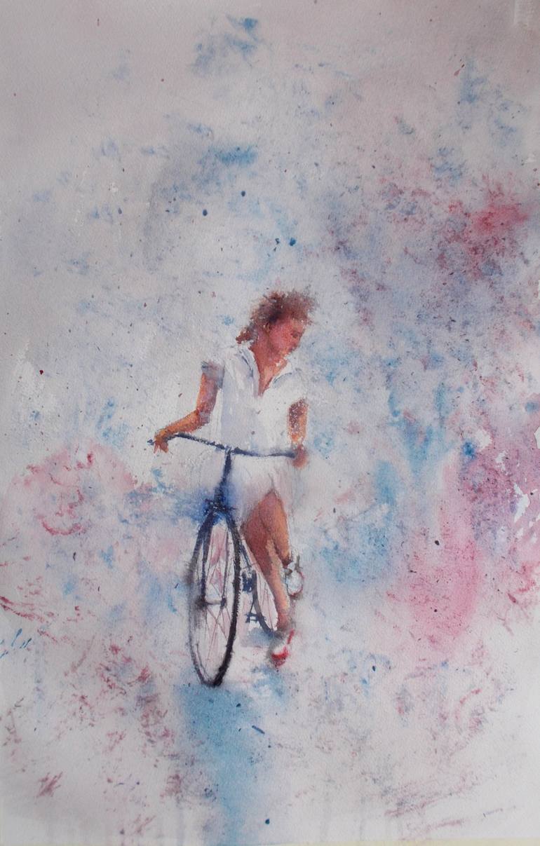 a beautiful lady with her bike This artwork is done on 300 g Fabriano Artistico watercolor paper with Winsor&Newton colors. Signed on the front, the Certificate of Authenticity is included. Please don't hesitate to get in touch with me if you have any questions about this artwork.