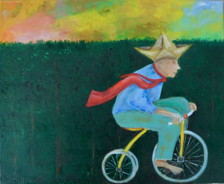 A man riding a bicycle through a dark forest - suggests thinking about life's trials and how we keep the light in ourselves (we all come from childhood) despite the darkness and difficulties of the world around us. The bicycle, often associated with childhood joys, here becomes a means of overcoming...