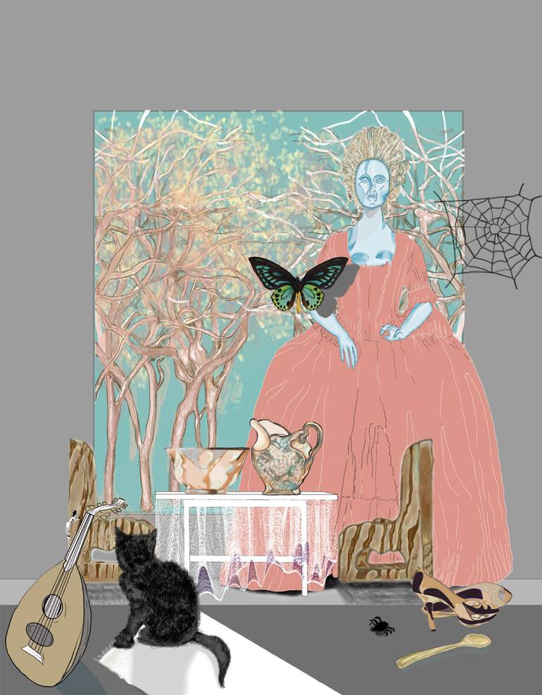 dali,surrealism,original,hand painted,oil painting manaquin,cat,winter trees,