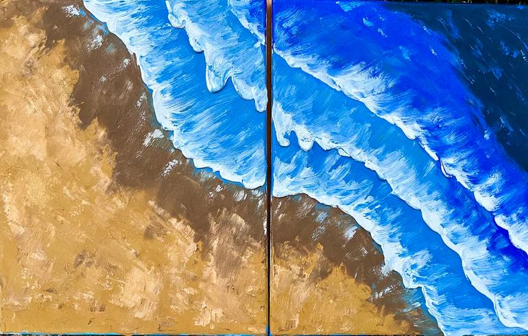 Abstract Ocean Waves Diptych Painting - Original Beach Art on Canvas Bring the calming essence of the ocean into your home with this beautiful diptych painting that captures gentle waves rolling onto a sandy shore. This two-part piece depicts an aerial view of the beach with vibrant blue waves that...