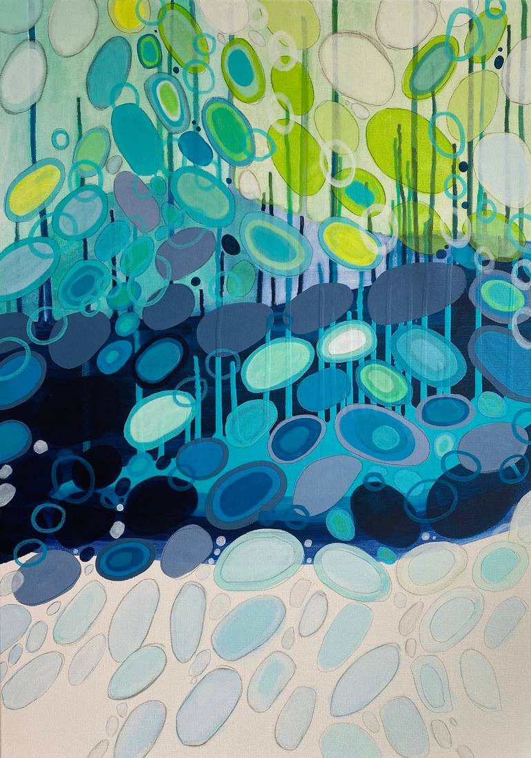 “IT IS IMPORTANT TO KEEP SIGHT OF YOUR OWN NEEDS IN YOUR OWN FOUR WALLS” I am convinced that art has a transformative power and can help us do just that. For this reason, I have made it my mission to accompany you on this path. My art is intended to serve as a daily reminder - it reminds you to take a deep breath, stay calm and focus on working towards your goals. Because this is the only way you can put your mind in a calm state and be successful! MY TOOLS Colors The effect of colors on our mind and mood is undisputed. They can influence, motivate or calm us. This is exactly where I come in: I want to help you use the positive power of colors. Red represents energy and activity - it keeps you alert and focused. Blue, on the other hand, has a calming and relaxing effect on the body and mind. Yellow, on the other hand, promotes your creativity and joy in life. Circles The round shape of the circle has a calming and balancing effect on us humans. It symbolizes infinity and harmony. In nature we find organic shapes such as cells or bubbles, which are also circular. The viewer is literally sent on journeys to himself by looking at circles that grow across the picture surface - I call them "bubbles". White The use of white is a central element of my works. It fascinates me. Although white is often perceived as “colorless” - or precisely because of that - it can still have enormous effects on our psyche: it stands for purity as well as emptiness; it leaves room for breathing as well as fullness. I skilfully play with these opposites and create a place of calm in the middle of the hectic life of our time. My works of art encourage you to pause - perhaps even consciously look inwards, away from all distractions.