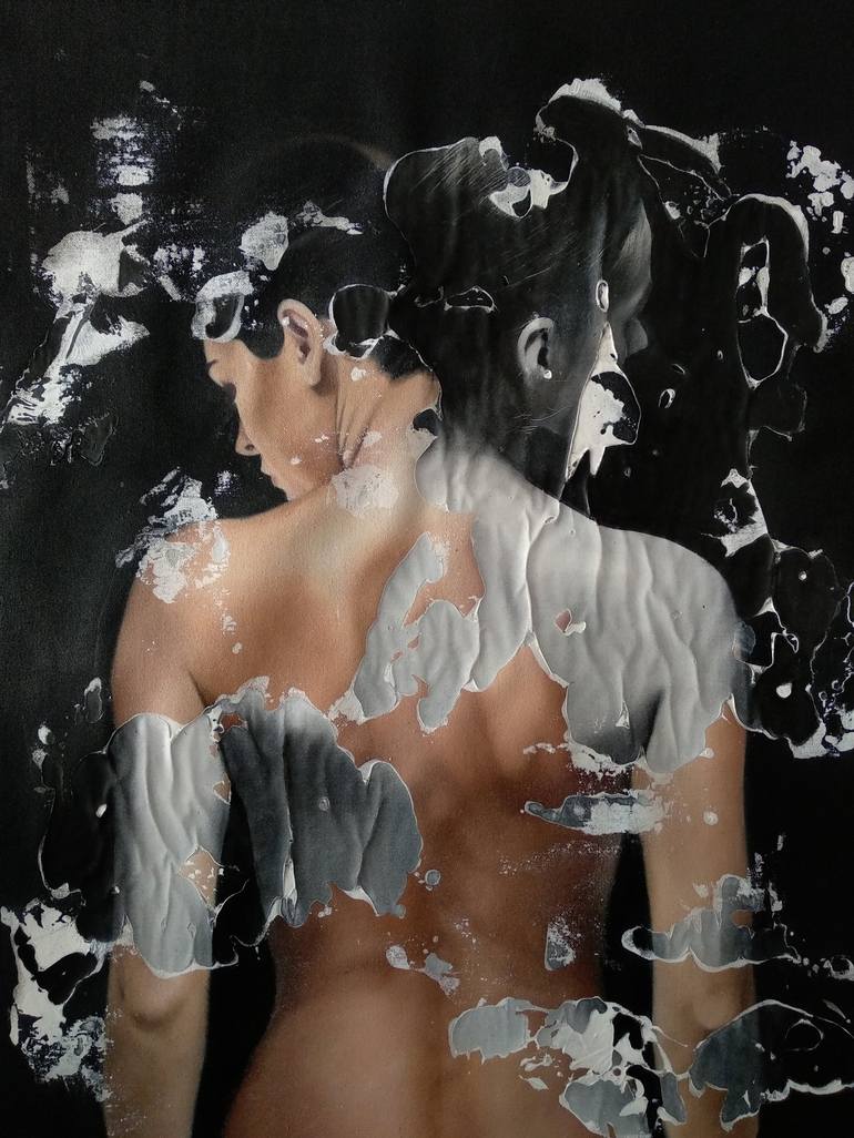 Raúl Lara Naranjo (Morón de la Frontera, Seville, Spain, (1980). Like every child, Raúl showed determination in his first scribbles and soon his parents observed how he spent hours in front of hundreds of papers that he painted and painted, doing everything kind of drawings. That motivated him to be enrolled in painting classes at an academy at the age of 9 so that he could learn about the fundamentals of pictorial art. Thanks to these classes, he began in the oil technique and began to make his first paintings for family and friends, always in small formats. From that moment his training has been self-taught, guided by inspiration, by the hours and hours in front of countless canvases, by the readings he has done, by videos, online information ... Almost all his knowledge about painting has been the result of his interest, his passion, his curiosity and desire to learn, and above all, his innate quality for painting. Now in his maturity, not only vital but pictorial, he manages to capture in his painting all that learning, which continues to develop day by day, In the beginning, his painting was always classic and realistic: seascapes, still lifes, Andalusian patios ... Little by little, always self-taught and inspired by contemporary artists, he began to explore more modern techniques, alternating various media such as oils, acrylics, pastels or various inks up to the transfer of images, with which he achieves that characteristic result that gives his work that unique appearance. greater expressiveness to the paintings and alternating various mediums such as oils, acrylics, pastels or various inks. Artist statement My recent work explores the two parts that we all have, the "I" that we show and the interior, the one that only we fully know, the hidden one. Mark Twain said that every man is a moon with a hidden face that never shows anyone. I represent this on the canvas first whistling in a more or less classic way, using oils and acrylics, this would be the face we show. Once finished and properly dried, I transfer the image used as a painting motif onto the canvas, resulting in a black and white image. This creates a work that navigates between color and black and white, the thin and smooth layer of paint versus the textured and broken caused by the transfer of the image and the mediums used for the same.