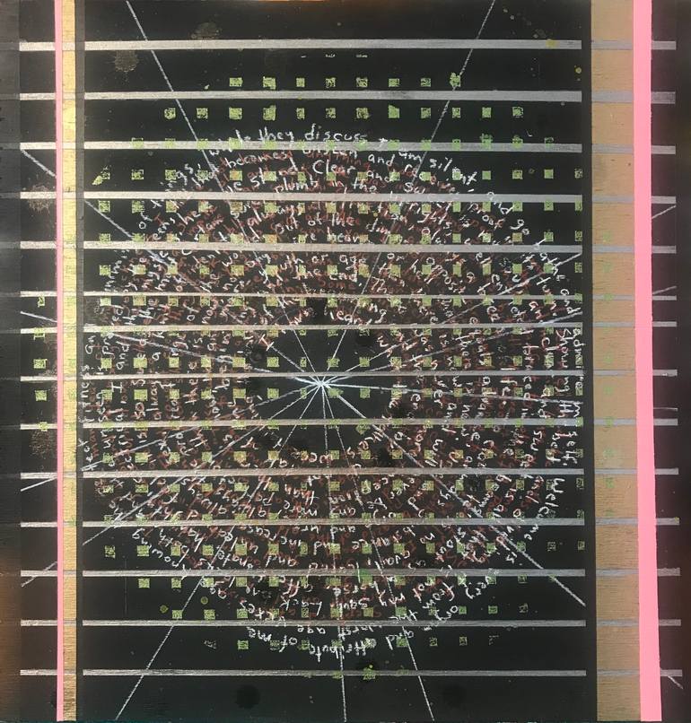 black and white, silver and gold, rectangular and radial; writing on the wall: legible, incomprehensible; the universe is orderly, understandable to the clairvoyant. painting signed, dated and numbered on the back; custom hardwood frame, ready to hang.
