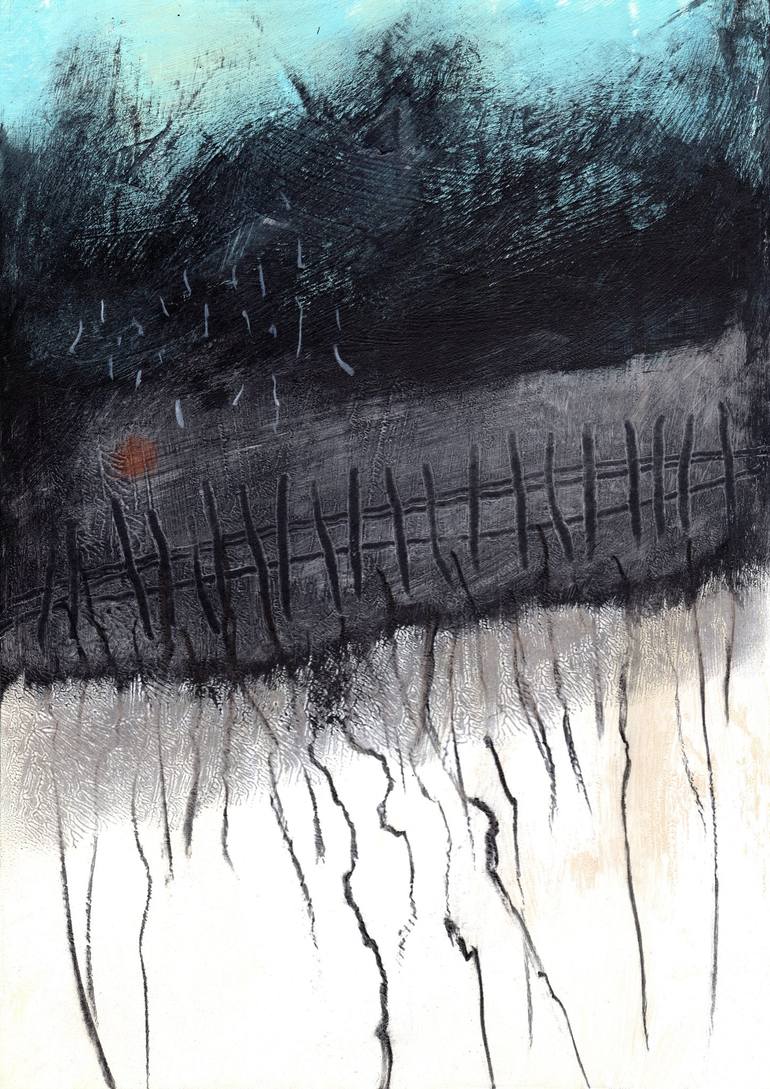 Mixed media on laminated cardboard, with superimposed layers of acrylic, chalk, oil… Framed in an white frame for objects with extra depth/size 42,5 x 32,5 x 3,5 cm. This artwork belongs to a series with 9 pieces called "dusk - storm line"