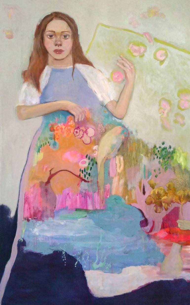 oil painting on canvas. A young woman stands in front of us, she wears a dress whose motifs merge with the surrounding landscape, she escapes into an imaginary world. Signed and dated on the back, it will be send carrefully rolled in a tube, accompanied by a certificate of authenticity signed by the...