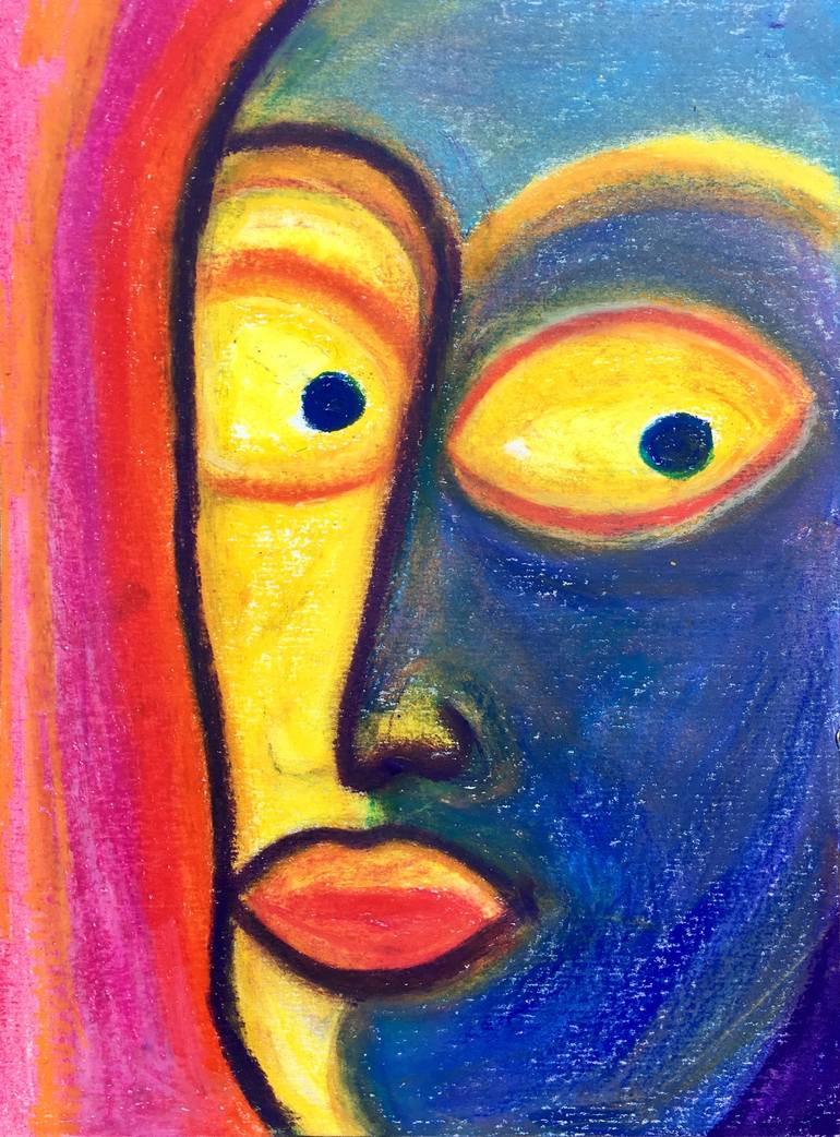 Oil pastel on paper. Naive face. Bright colors blue, yellow, red, pink.