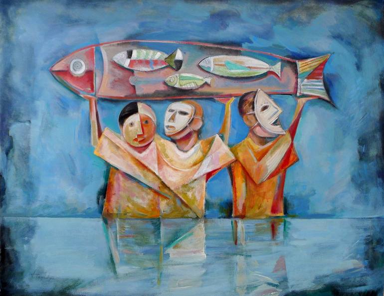 The painting depicts an extraordinary event: three fishermen have successfully caught a massive fish, and, more interestingly, inside this enormous fish, you can see many small fish. This work of art embodies the idea of unexpectedness and wonder that can be found in the natural world. The unique co...