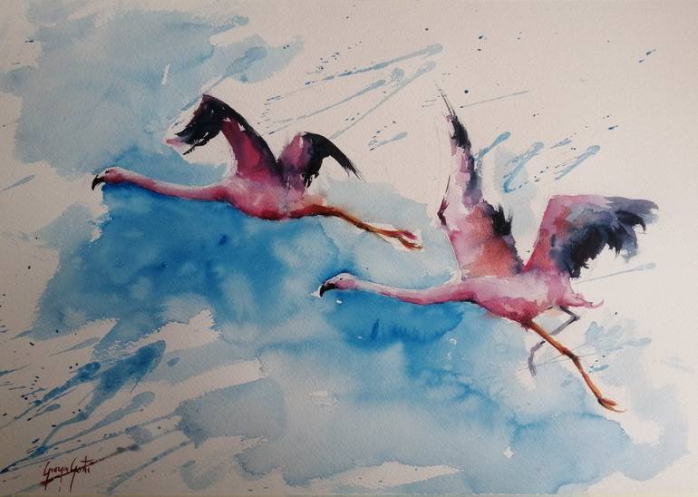 some colorful flamingos flying in the sky. This artwork is done on 300 g Fabriano Artistico watercolor paper with Winsor&Newton colors. Signed on the front, the Certificate of Authenticity is included. Please don't hesitate to get in touch with me if you have any questions about this artwork.