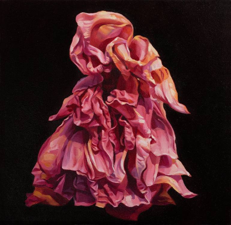 This painting is part of a series depicting flowers - but not in the traditional sense of beauty. These are flowers marked by the passage of time, captured on the brink of wilting. I am fascinated by the dramatic structure that remains after the once vibrant, alluring form fades. As if, with the re...