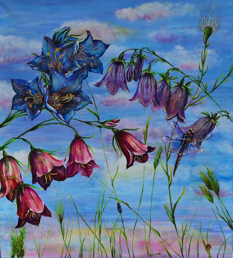 The painting depicts bells and a dragonfly. I wanted to convey a light breeze. The painting is made with acrylic paints on canvas with a stretcher. Linen canvas, fine-grained. The painting is covered with a glossy varnish.