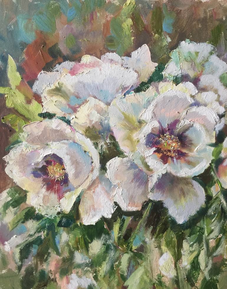 In our garden, a tree-like peony grows. Its aroma is magnificent! The flowers are incredibly beautiful. The painting was painted from nature. Oil on canvas, 2020. There is a frame made of high quality plastic