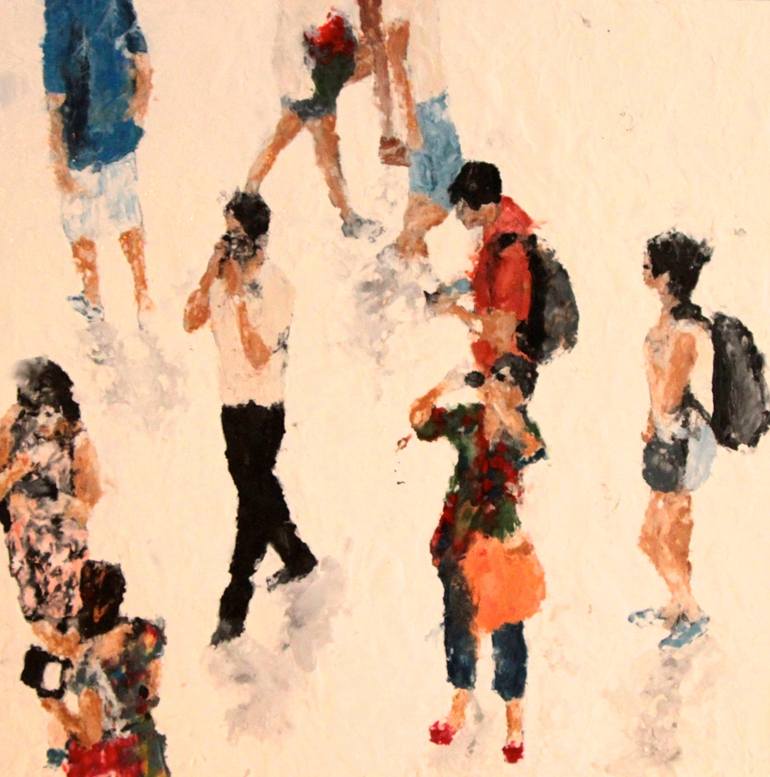 Hervé Carriou born in Brittany has been painting for twenty years. He lives in Paris. In his early years, he studied watercolor and the technique of old-fashioned oil painting. He now paints mainly in encaustic for about 10 years and more recently in ink and acrylic on plexiglas. His favorite themes are: the crowd, urban landscapes, street scenes, seascapes, portraits. The encaustic is a technique dating back to ancient Egypt (Fayum portraits from the 1st to the 5th century) and consisting of using the beeswax heated, mixed with pigments. This medium thanks to the amber finish and the transparency of the wax allows fuzzy and fade effects. Inverted glass painting (or painting under glass) is an artistic technique that runs directly on a sheet of glass or plexiglass. The glass or plexiglass supports the painting as would a canvas. Welded to the glass, it is through this support that one contemplates the work. Thus glass or plexiglass serves as both a support and a protective varnish. Note that this is a "cold" painting technique so that the process does not require baking. The work is executed on the back of the support and requires to compose with a "mirror effect" during the execution of the image since what is painted upside down on the right is in the place on the left.